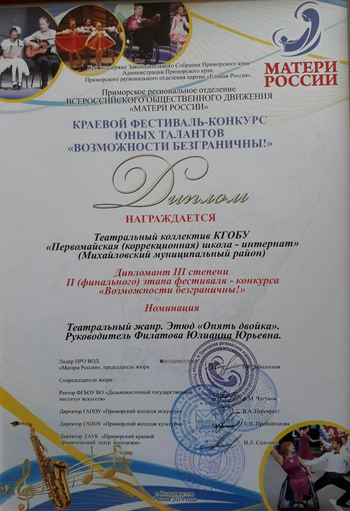 Мы - дипломанты краевого конкурса. 03 Июнь 2019 633 просмотра ~5 мин 15 Нравится 1 июня театральный коллектив нашей школы принял участие и стал дипломантом краевого фестиваля - конкурса юных талантов "Возможности безграничны". Ребята показали этюд : "Опять двойка". Руководитель постановки Ю.Ю.Филатова. Фотогалерея Поделиться Поделиться:
