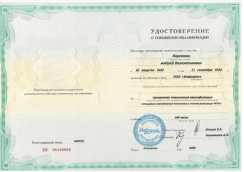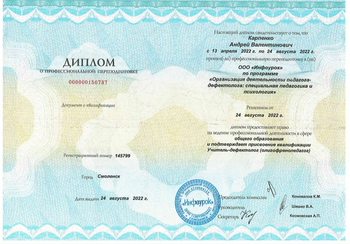 13.04.2022 г. - 24.08.2022 г. - ООО "Инфоурок" - профессиональная переподготовка по программе "Организация деятельности педагога-дефетколога: специальная педагогика и психология"