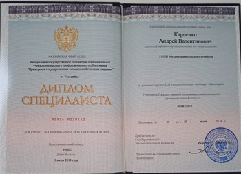 2014 г. - Приморская государственная сельскохозяйственная академия - инженер